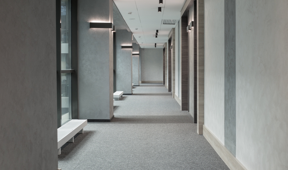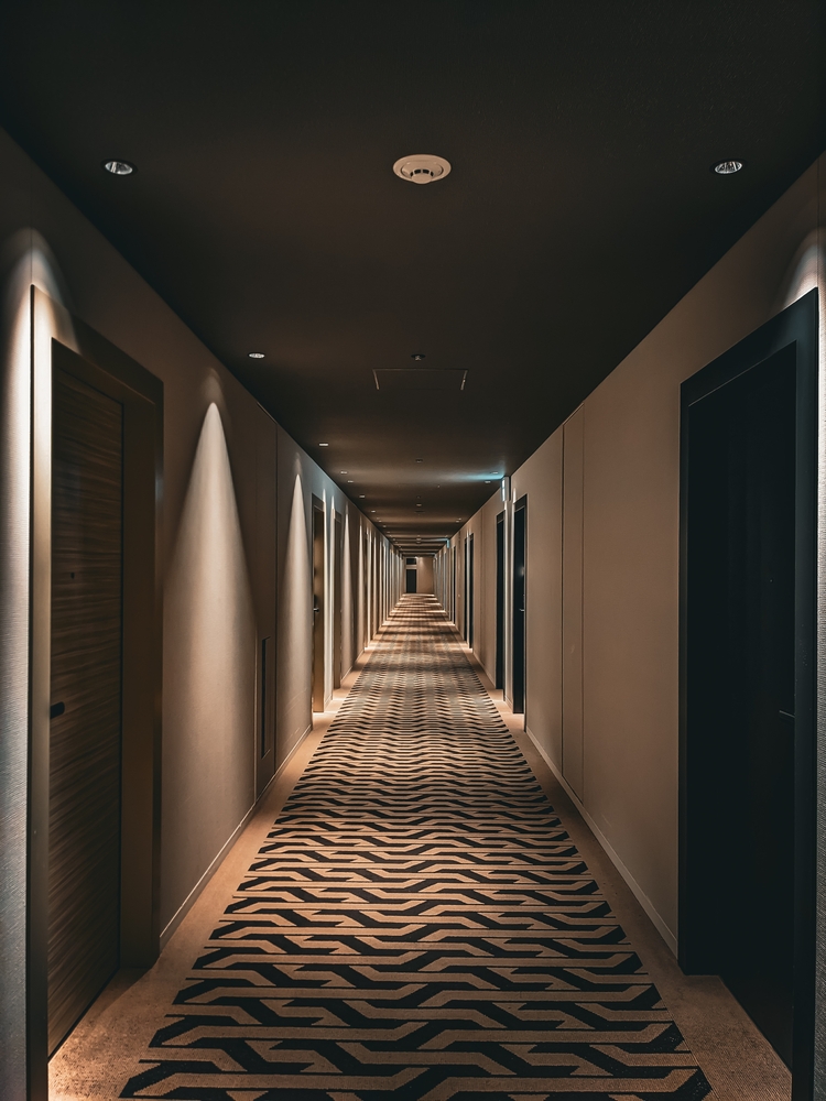 W lobby i korytarzach długich jak pas startowy. Indywidualny wzór (np. subtelny gradient kierunkowy) prowadzi gościa i maskuje mikrozabrudzenia. Włókna solution dyed (barwione w masie) są bardziej odporne na odplamianie i chemię – świetny wybór dla korytarzy i pokoi o dużym obłożeniu.